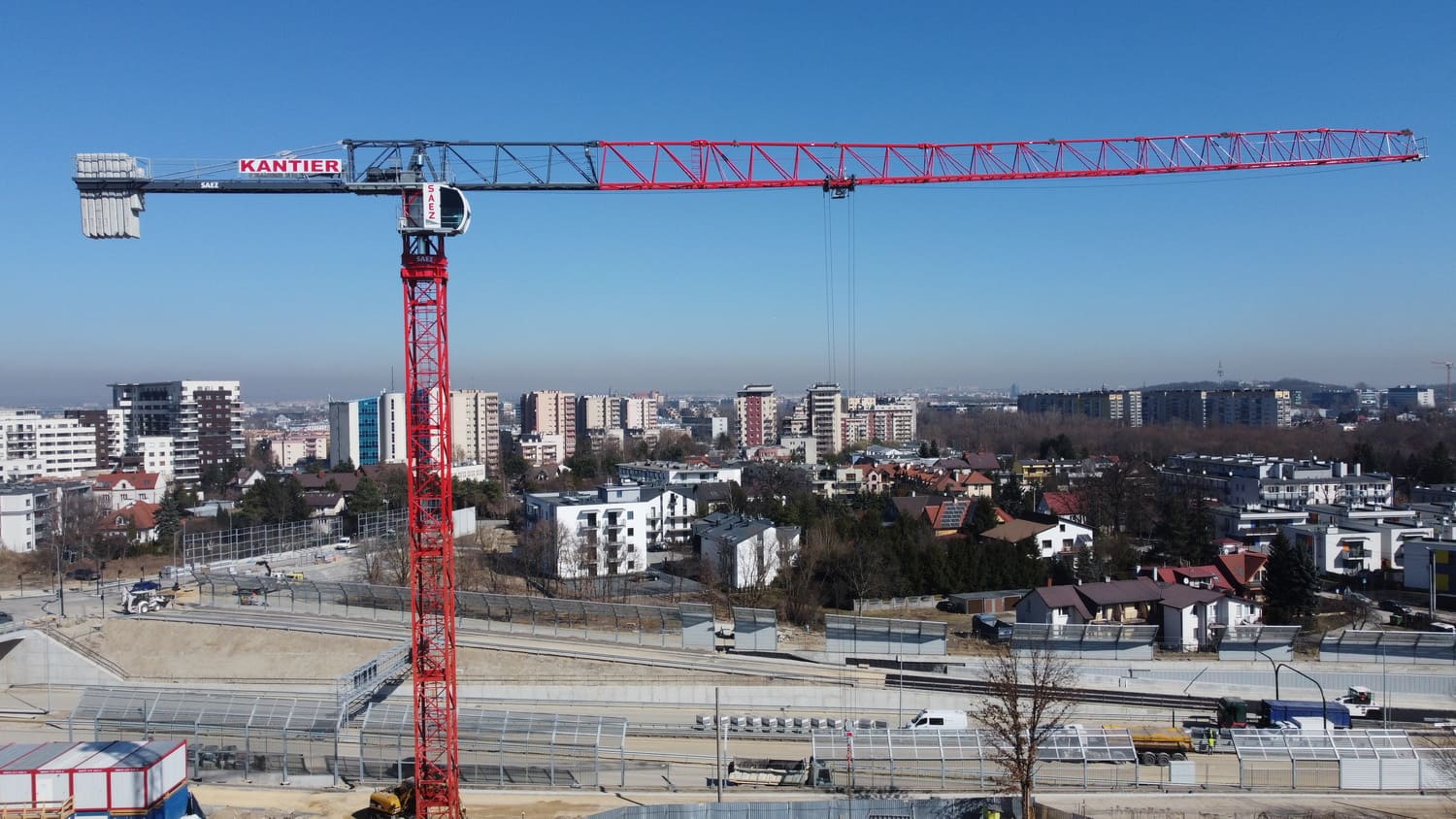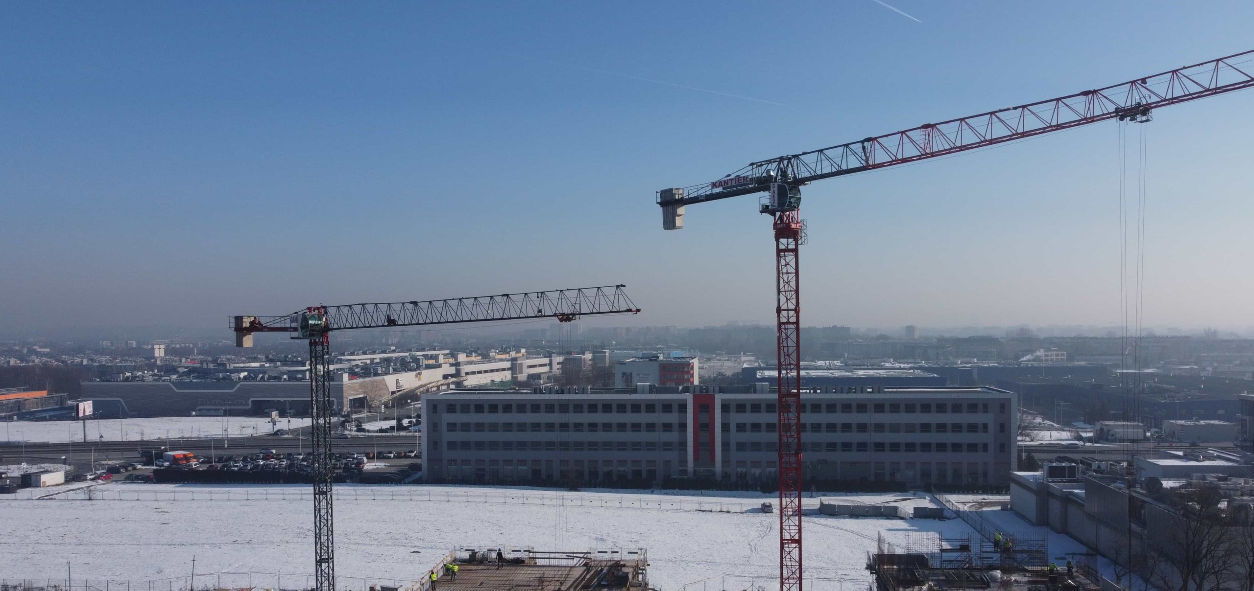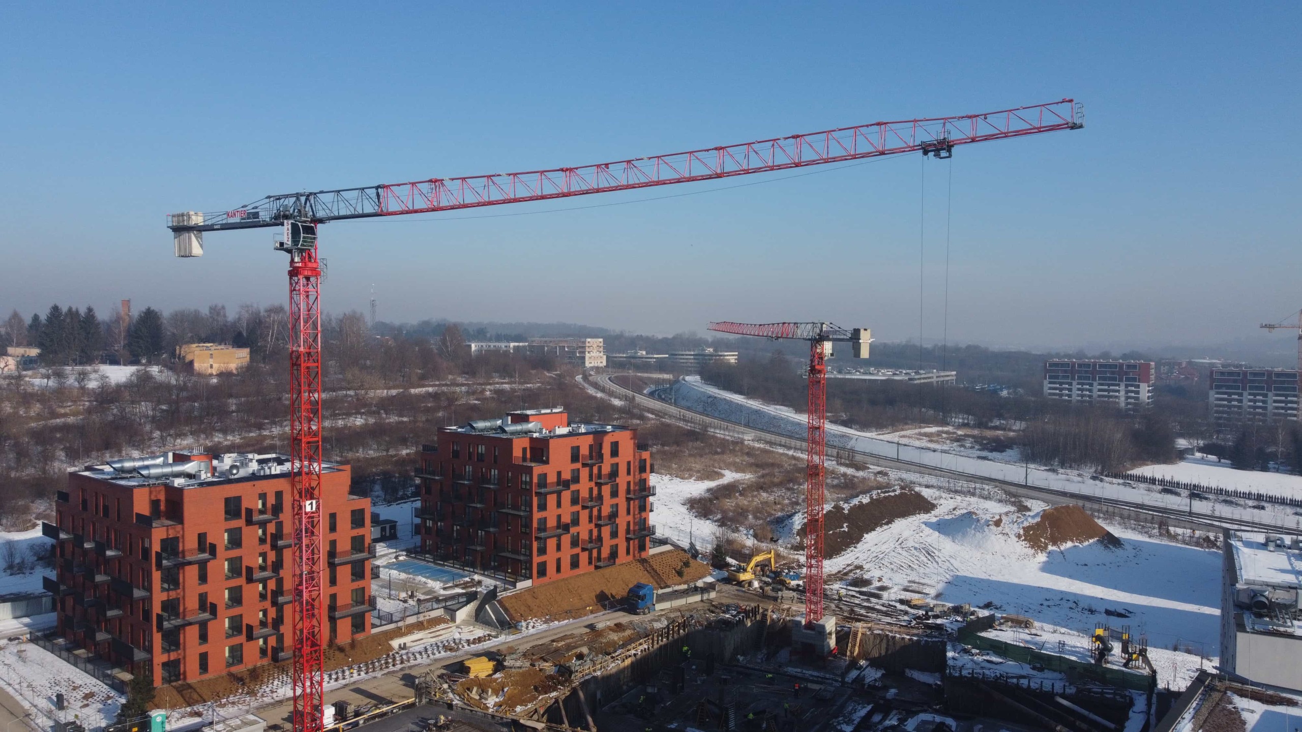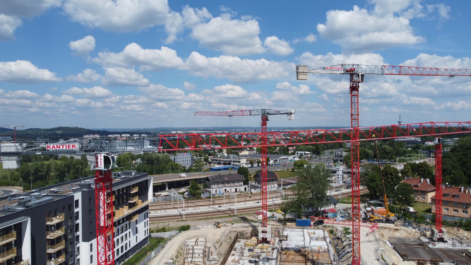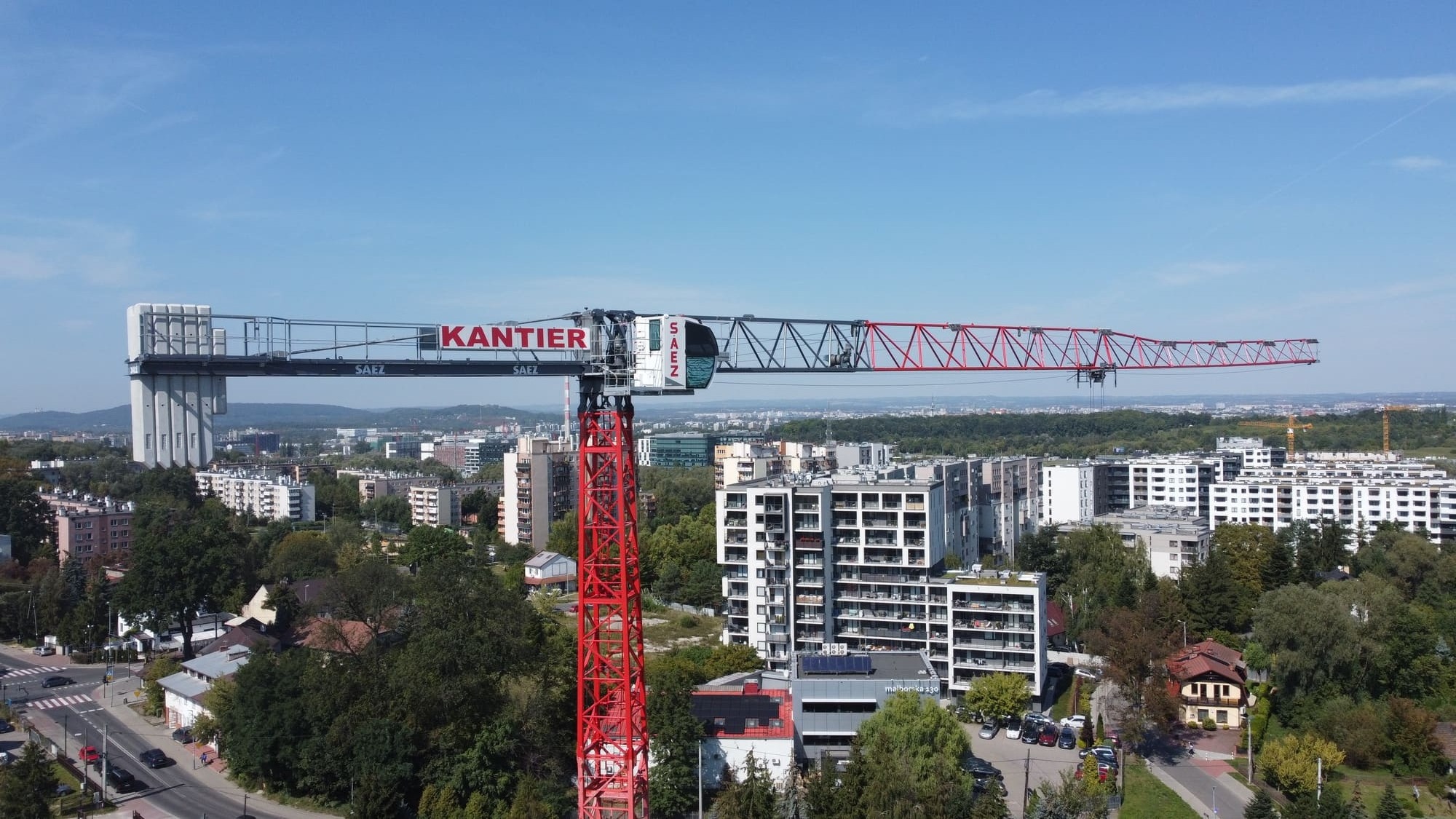 Budowa budynków biurowych przy ulicy Wadowickiej. Zaangażowane zostały trzy żurawie wieżowe: SAEZ TL55, SEZ TLS55.17 i SAEZ S65.