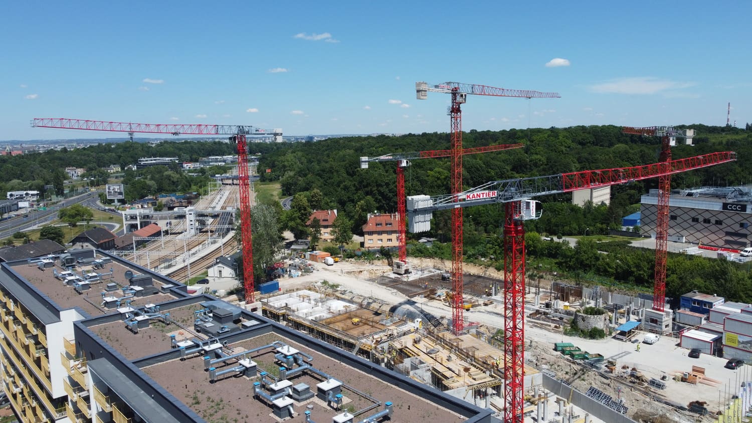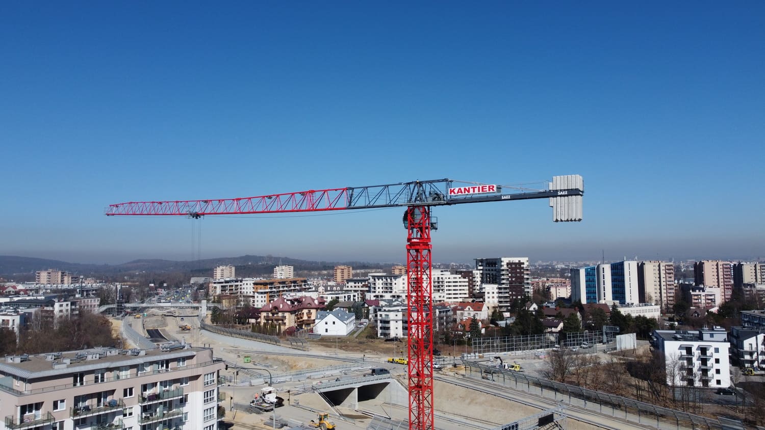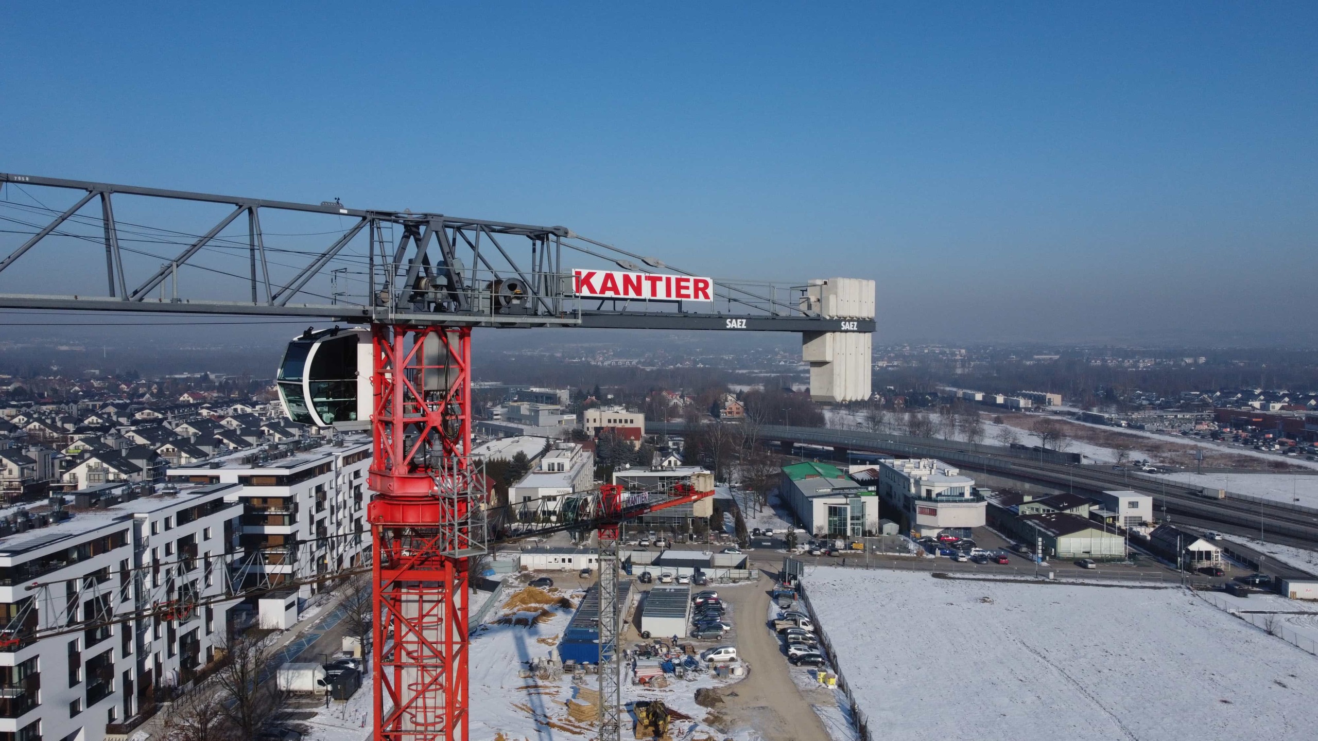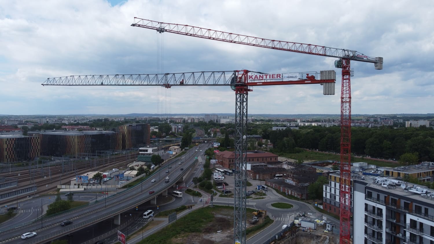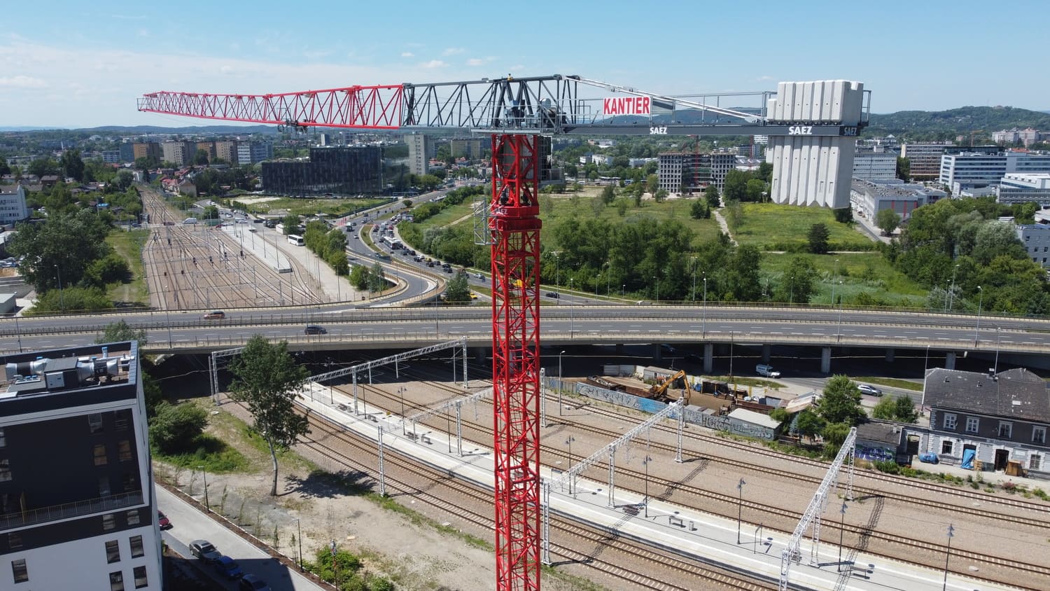 Budowa budynków biurowych przy ulicy Wadowickiej. Zaangażowane zostały trzy żurawie wieżowe: SAEZ TL55, SEZ TLS55.17 i SAEZ S65.