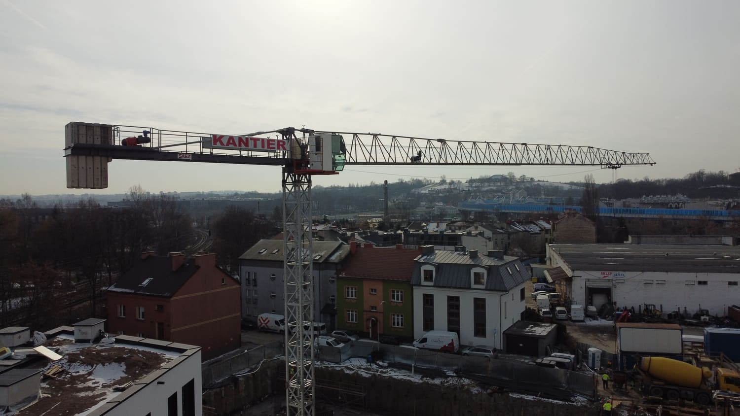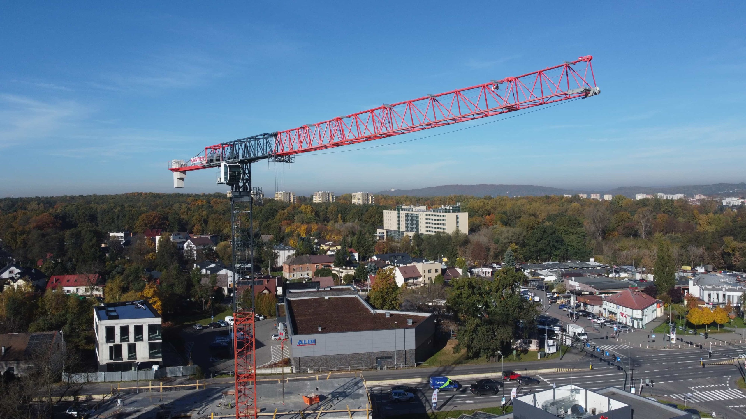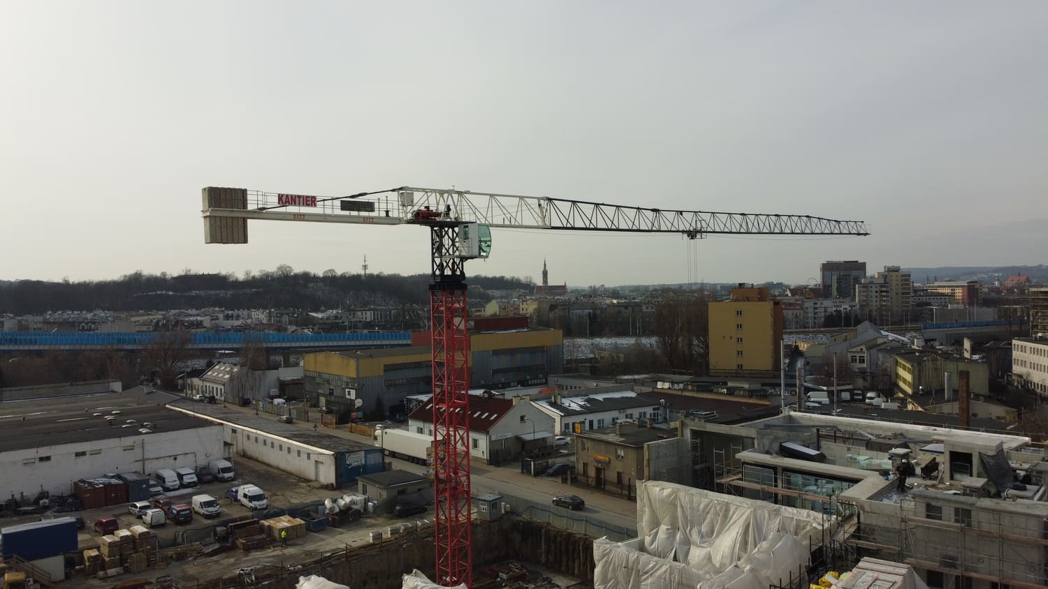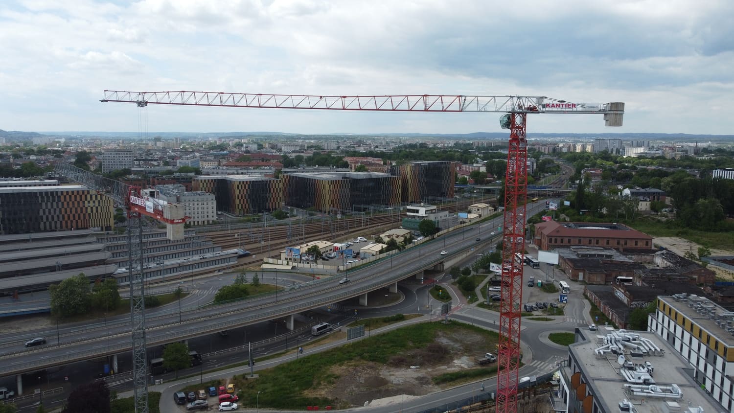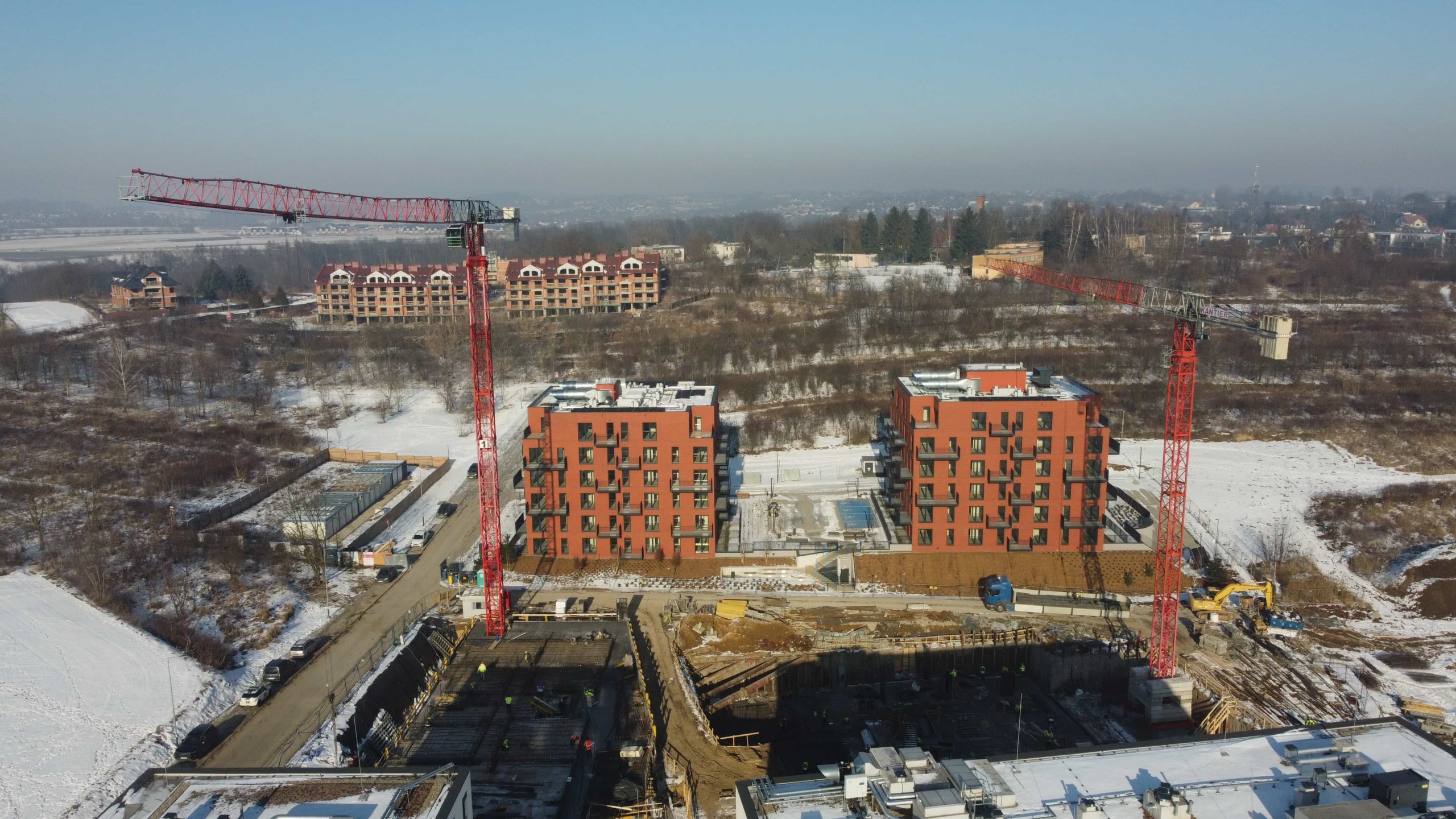 Budowa budynków biurowych przy ulicy Wadowickiej. Zaangażowane zostały trzy żurawie wieżowe: SAEZ TL55, SEZ TLS55.17 i SAEZ S65.